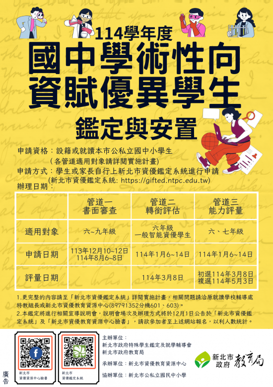 • 主旨:公告「新北市114學年度國民中學學術性向資賦優異學生鑑定安置工作實施計畫」及相關宣導。
