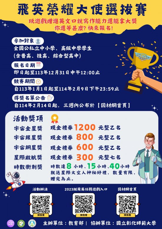 • 報名期間即日起至113年12月31日(星期二)中午12時止,比賽採先報名後作答制,請參賽者確實填寫報名表,先完成報名作業,報名網址:https://docs.google.com/forms/d/e/1FAI ... mtwNhDW8bDNRp9HQ/viewform