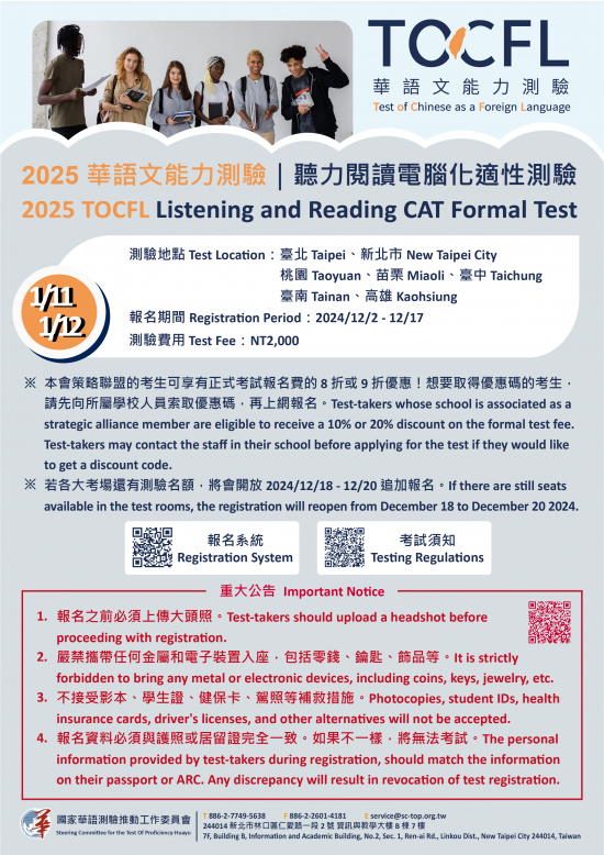 • 114年1月11日(星期六):聽讀測驗-電腦化適性測驗。