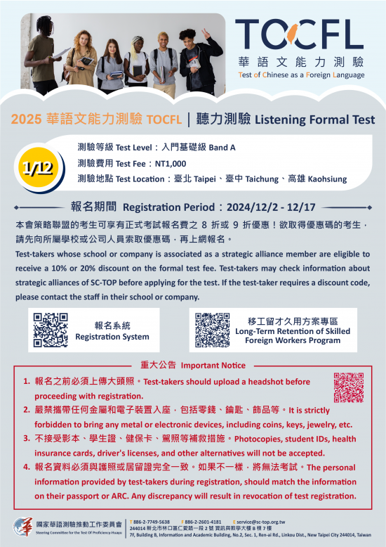 • 114年1月12日(星期日):聽讀測驗-電腦化適性測驗、聽力測驗入門基礎級(移工留才久用方案)。