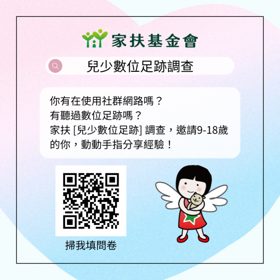• 該會長期關注兒童及少年權益發展與實踐,為了解我國兒童及少年運用社群媒體/網路使用與數位足跡之情形,期以此主題進行調查和倡議工作。