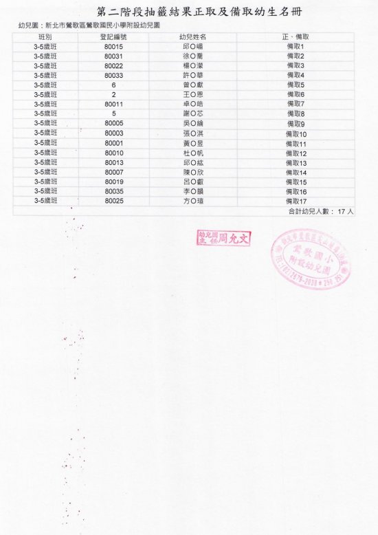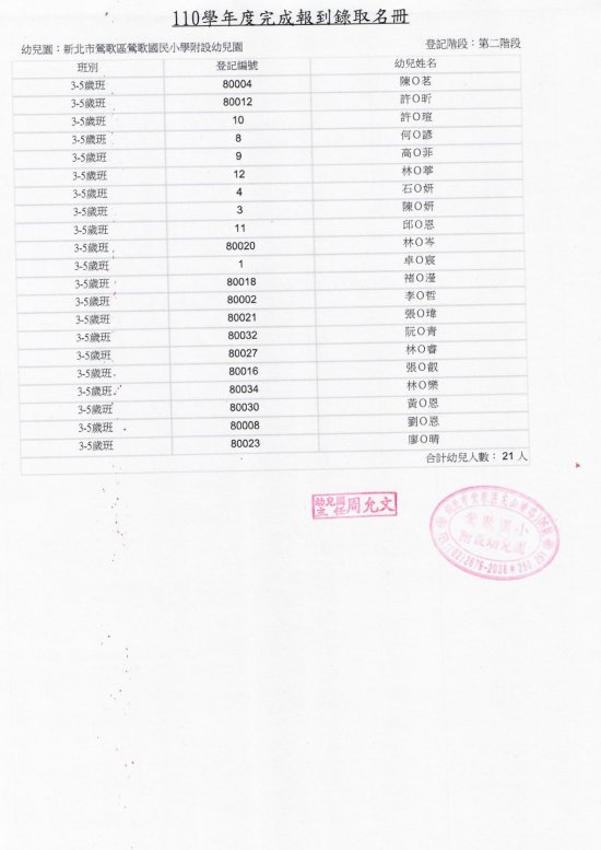 鶯歌國小附設幼兒園110學年度幼兒園完成報到名冊、備取名冊(如附件)