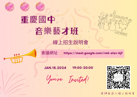 藝術才能音樂班將於114年1月15日(星期三)晚上7點至8點辦理線上招生說明會,連結網址為:https://meet.google.com/rmk-stev-bjf