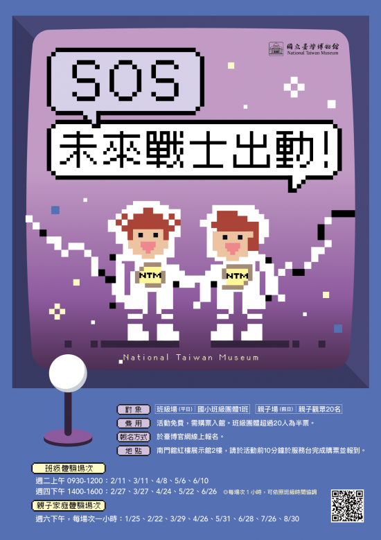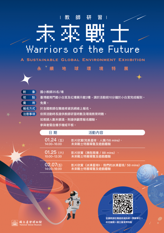 • 本館訂於114年1月24日(星期五)、1月25日(星期六)及2月7日(星期五)假南門館(臺北市中正區南昌路一段1號)辦理三梯次教師研習課程,請轉知所屬並鼓勵教師報名參加。參與研習之教師,將依課程時長核發研習及環境教育時數。