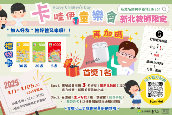 • 活動方式:請於「新北市名師共學基地」推薦3名本市教師加入,截圖並輸入「服務學校」、「教師姓名」留言至訊息處,即可參加抽獎活動。