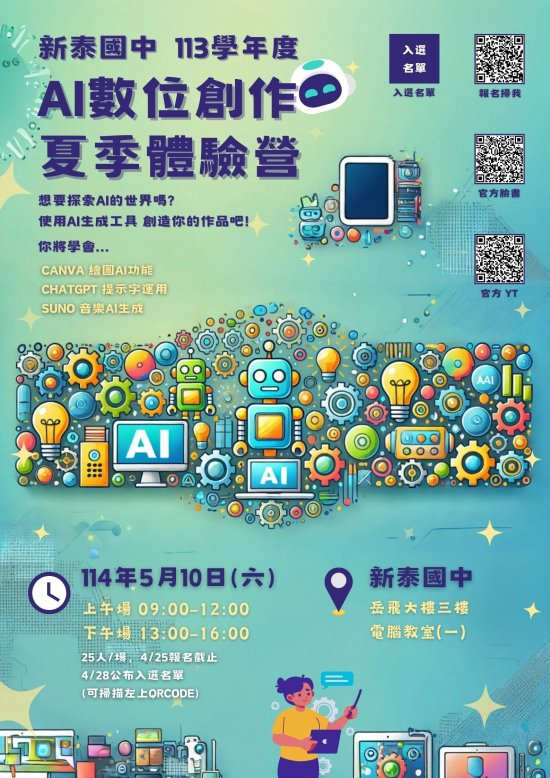 • 營隊以「探索人工智慧」為主題。課程內容涵蓋AI基礎認識、實際應用設計,透過有趣的活動與實作,啟發創新思維,培養解決問題的能力!旨揭說明如下: