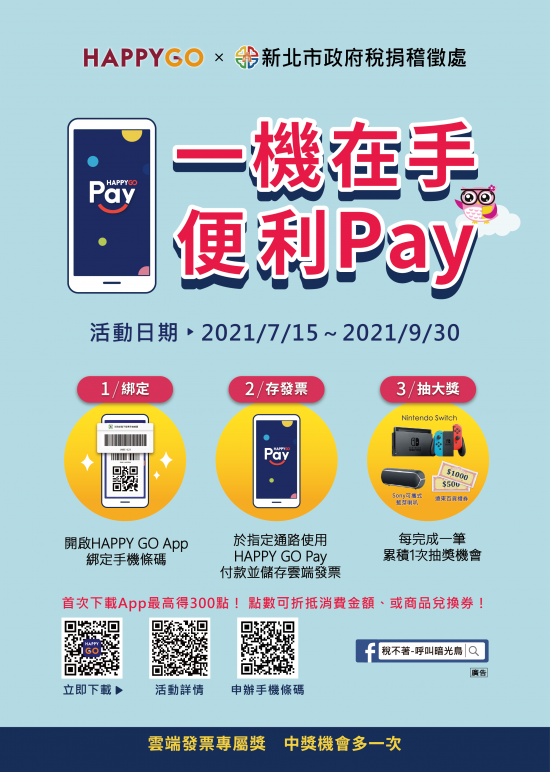 一、旨揭活動辦法如下: 使用HAPPY GO Pay於指定通路(全臺遠東百貨、遠東SOGO百貨、遠東巨城購物中心、愛買、TheMall遠企購物中心、c!ty ''super、遠傳電信直營門市、遠傳friDay購物、SOGO istore、香格里拉台北遠東國際大飯店、香格里拉台南遠東國際大飯店、Mega50)消費,單筆消費不限金額,並將雲端發票存入「HAPPY GO App」中之載具,每消費1筆,即可累積1次抽獎機會。 獎項有Switch、Sony可攜式藍芽喇叭、遠東集團禮券1,000元、500元、HAPPY GO點數等共258個獎品,消費愈多筆,中獎機率愈高。 二、活動詳情請上「稅不著—呼叫暗光鳥」粉絲專頁(https://www.facebook.com/ntpctax/)或活動網站( https://event.happygocard.com.tw/app/u ... 021_NTPinvoice_part2.html)查詢。