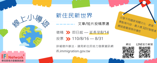 主旨:轉知內政部移民署「新住民培力發展資訊網站」新住民新世界-線上小導遊文章及短片投稿活動,請貴校協助宣導,並鼓勵踴躍參加,請查照。