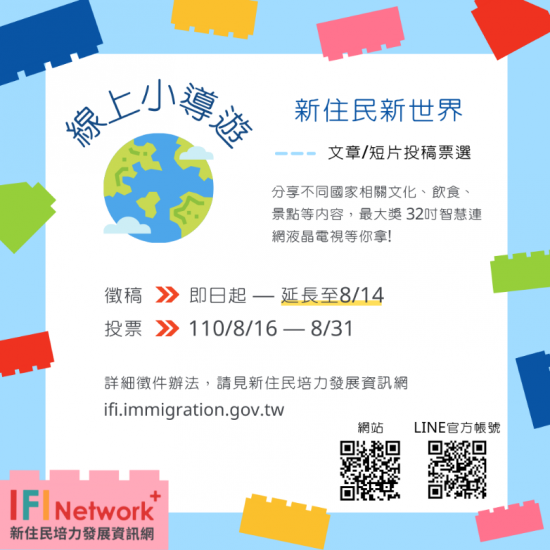 三、活動摘述如下: 徵稿時間:110年5月1日至8月14日止。 投稿方式: 文章投稿:以活動主題為題材自訂題目,中文撰稿300至1,000字,並提供1組照片(最多10張,合法使用)。 短片投稿:以活動主題為題材拍攝3至5分鐘以內短片,包含短片主題及簡短說明(檔案不超過200MB)。 每人限投稿文章及短片各1件,將投稿文章或短片電子檔傳至網站Line官方帳號(ID:@ifitw)之報名表單完成投稿。 活動投票期間:110年8月16日起至8月31日止,可透過Facebook分享和親友拉票,每人每日最多可於文章及短片各投3票。 獎品豐富,並將於110年9月17日前公布得獎名單。