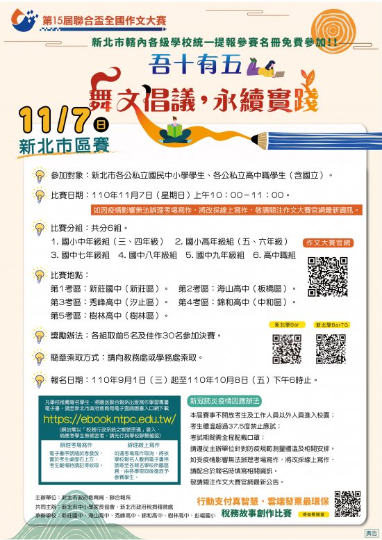 一、依據本市國民小學提升學生國語文能力四年計畫(108-111年度)辦理。 二、為激發學生文字表達之興趣,特舉辦本競賽;另為鼓勵參賽學生並結合本市環保無紙化政策,凡學校推薦報名學生,將贈送第14屆聯合盃作文大賽作品專輯,考試當天請應考學生憑入場證至各年級組別大會服務臺領取電子書序號,並至本局電子書雲端圖書入口網觀摩學習(因應疫情,如辦理考場寫作,電子書序號將隨試卷發放;如辦理線上寫作,將依學校報名人數將電子書序號寄至各報名學校所屬區務,由學校取回後發放予參賽學生)。