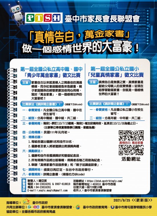 四、本活動最新資訊請至https://ptsh.mystrikingly.com/查詢;如有疑義,請逕洽臺中市家長會長聯盟會鍾先生,電話:(04)23016291或0907618819、電子信箱:yogic.magic@gmail.com。