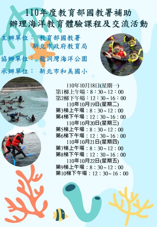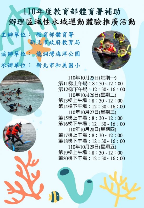 二、辦理項目: 浮潛體驗:共計辦理20梯次,每梯次30人,依報名順序先後錄取。 辦理時間:分為上、下午梯次,上午梯次8時30分至12時00分;下午梯次12時30分至16時。