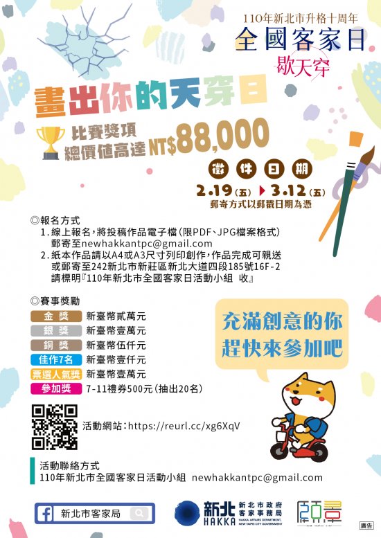 一、本活動由客家委員會指導,新北市政府主辦,新北市政府客家事務局承辦。 二、天穿日(農曆正月20日)在民國99年正式被訂定為全國客家日,為感念女媧娘娘補天相助,客家族群每到這一天會放下手邊工作,讓大地休養生息,隨時代演進,如今已成為愛惜自然及響應環保的重要節日,透過數位轉型,讓民眾以線上繪畫的方式描繪天穿想像,推廣客家文化。 三、本活動徵件時間為110年2月19日至3月12日止,請鼓勵貴校學生踴躍報名參加,相關訊息詳如附件,或請參閱本活動網站(reurl.cc/XeLExM)。